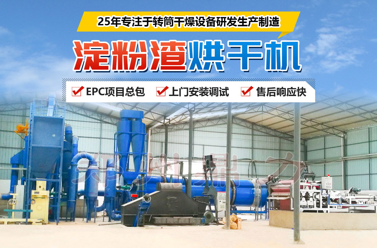 物料流程是:水分80-85%物料先經(jīng)過專用脫水機,水分脫除到68%左右,由螺旋輸送機送入攪拌滾筒烘干機實現(xiàn)順流烘干,物料在抄板下不斷抄起、散落呈螺旋行進式前進,內(nèi)置攪拌槳葉裝置將物料充分攪拌打散破碎,充分擴大物料與熱氣熱交換面積,物料與熱氣充分質(zhì)熱交換,水分迅速蒸發(fā)汽化,達到35%左右,完成滾筒干燥過程,由螺旋輸送機排出,進入半濕物料專用粉碎機,粉碎物料粒度到1mm以下,進入脈沖氣流烘干過程,物料迅速降到12%以下。(可避免物料在烘干過程中糊化、糖化現(xiàn)象發(fā)生,造成物料外觀顏色發(fā)黑),由旋風卸料器和脈沖袋式收塵器回收干料粉,廢氣達標排放,完成整個烘干過程。滾筒內(nèi)部安裝有震打清理裝置,防止物料與筒壁粘接。