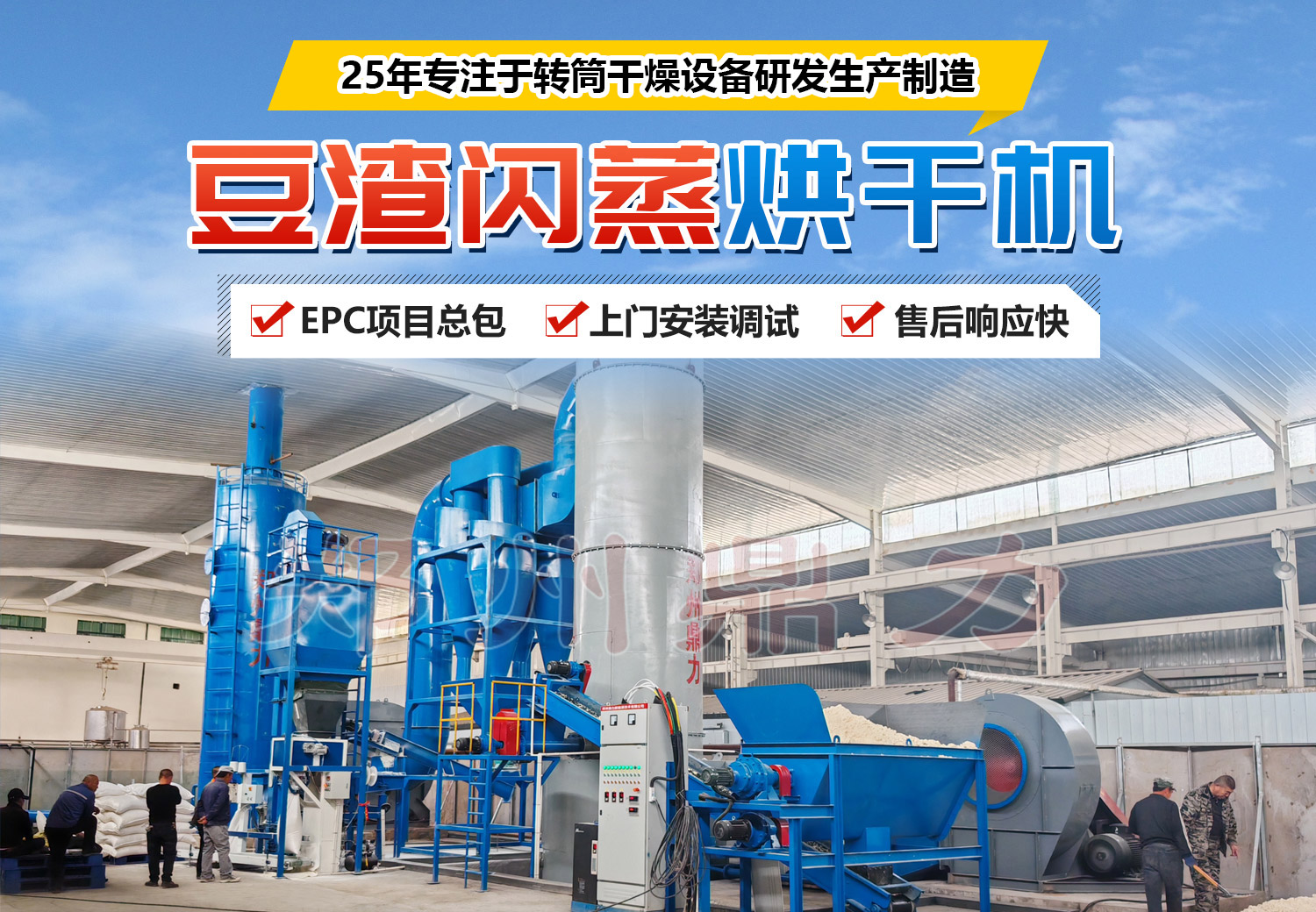 豆渣閃蒸烘干機由干燥主機、加料器、熱源裝置(熱風(fēng)爐或蒸汽)、空氣過濾器、鼓風(fēng)機、旋風(fēng)分離器、布袋除塵器、引風(fēng)機等關(guān)鍵部件組成。熱空氣切線進入干燥器底部,在攪拌器帶動下形成強有力的旋轉(zhuǎn)風(fēng)場。豆渣由螺旋加料器進入干燥器內(nèi),在高速旋轉(zhuǎn)攪拌槳的強烈作用下,物料受撞擊、磨擦及剪切力的作用下得到分散,塊狀物料迅速粉碎,與熱空氣充分接觸、受熱、干燥。脫水后的干物料隨熱氣流上升,分級環(huán)將大顆粒截留,小顆粒從環(huán)中心排出干燥器外,由旋風(fēng)分離器和除塵器回收,未干透或大塊物料受離心力作用甩向器壁,重新落到底部被粉碎干燥。