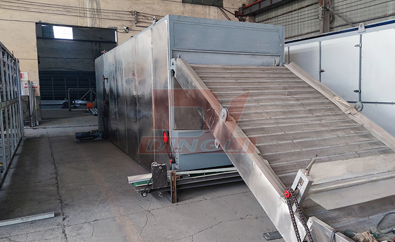 物料由給料機均勻地放置在網(wǎng)帶上。網(wǎng)帶一般采用12-60目不銹鋼絲網(wǎng),通過傳動裝置在干燥機內(nèi)牽引移動。干燥器由幾個單元組成。對于每個機組,熱空氣單獨循環(huán)。一些排出的氣體用專門的除濕鼓風機排出。廢氣通過調(diào)節(jié)閥進行控制。熱空氣從上到下或從下到上穿過覆蓋有材料的網(wǎng)帶,這將完成傳熱和傳質(zhì)過程。這個過程會帶走材料中的水分。網(wǎng)帶移動緩慢,運行速度可根據(jù)物料溫度自由調(diào)節(jié)。干燥后的最終產(chǎn)品將連續(xù)落入物料收集器中。上下循環(huán)機組可根據(jù)用戶需求自由配置。單元編號可以根據(jù)需求進行選擇。