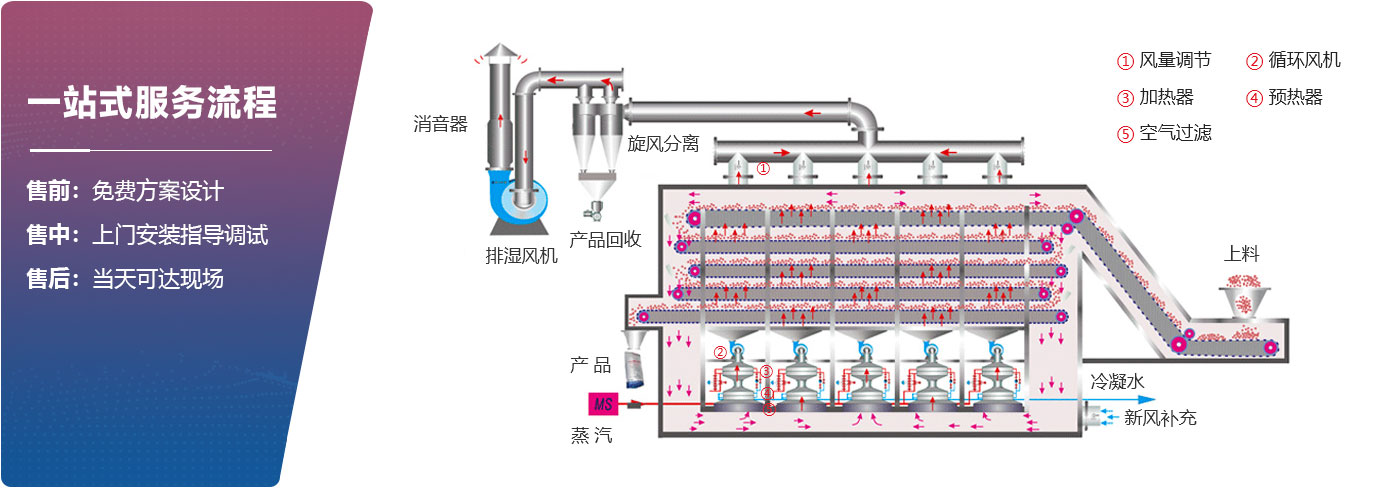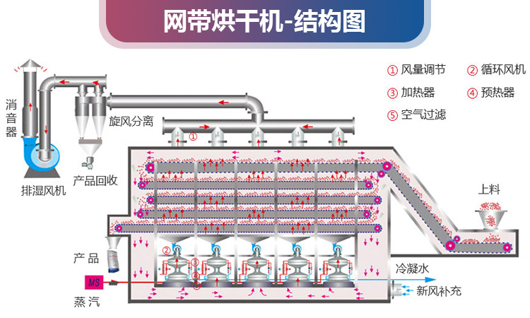 物料由給料機(jī)均勻地放置在網(wǎng)帶上。網(wǎng)帶一般采用12-60目不銹鋼絲網(wǎng),通過(guò)傳動(dòng)裝置在干燥機(jī)內(nèi)牽引移動(dòng)。干燥器由幾個(gè)單元組成。對(duì)于每個(gè)機(jī)組,熱空氣單獨(dú)循環(huán)。一些排出的氣體用專門的除濕鼓風(fēng)機(jī)排出。廢氣通過(guò)調(diào)節(jié)閥進(jìn)行控制。熱空氣從上到下或從下到上穿過(guò)覆蓋有材料的網(wǎng)帶,這將完成傳熱和傳質(zhì)過(guò)程。這個(gè)過(guò)程會(huì)帶走材料中的水分。網(wǎng)帶移動(dòng)緩慢,運(yùn)行速度可根據(jù)物料溫度自由調(diào)節(jié)。干燥后的最終產(chǎn)品將連續(xù)落入物料收集器中。上下循環(huán)機(jī)組可根據(jù)用戶需求自由配置。單元編號(hào)可以根據(jù)需求進(jìn)行選擇。
