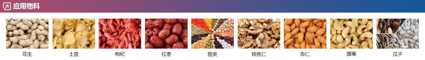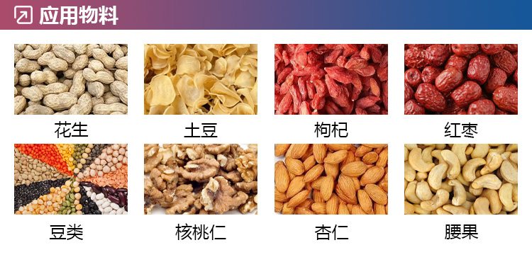 適用范圍:適用于塊狀、條狀、片狀和顆粒狀,如:花生、土豆、木薯、枸杞、紅棗、蔬菜、水果等。