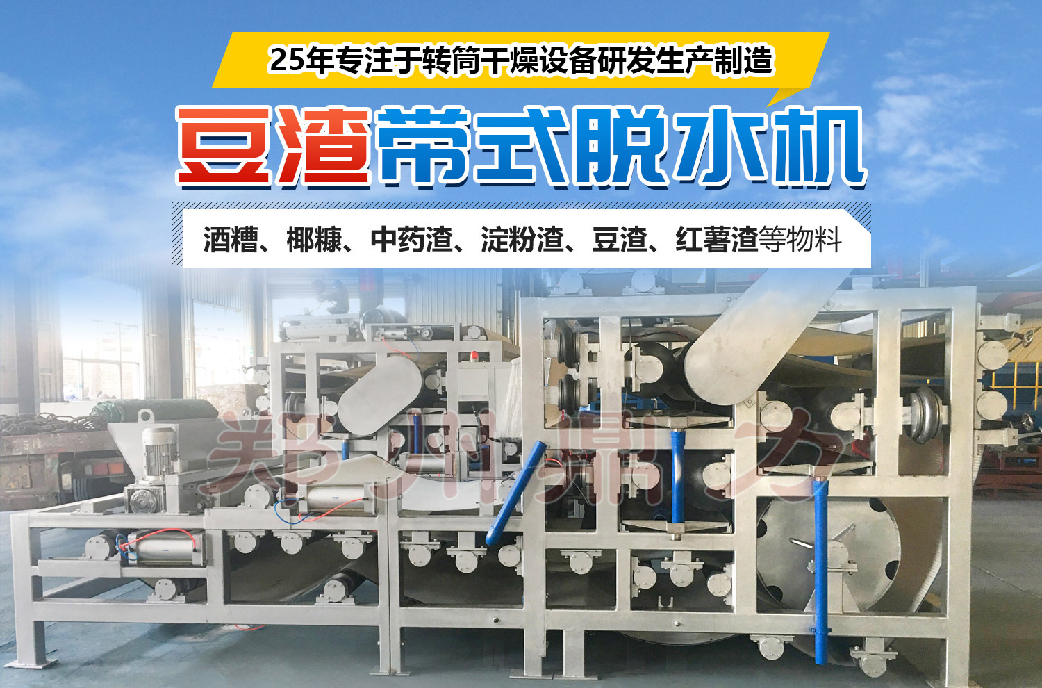 物料經(jīng)過輸送機(jī),輸送到脫水機(jī)的料斗中,經(jīng)過螺旋布料器均勻地鋪在濾帶上,濾帶隨著設(shè)備的運(yùn)行,限料板把料層高度刮平,使料的厚度完全均勻一致;然后上下兩條完全漲緊的環(huán)狀濾帶夾住料層,在驅(qū)動輥帶動下,脫水區(qū)內(nèi)的對輥連續(xù)多次機(jī)械擠壓,將大量的水份壓出。根據(jù)物料的特點(diǎn)自動調(diào)節(jié)擠壓力,滿足客戶對物料水分要求。